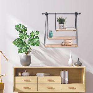 Etajera de perete GIFTDECOR, Leagan cu fir, metal si lemn, 67.5x62 cm, stil modern, negru-natur